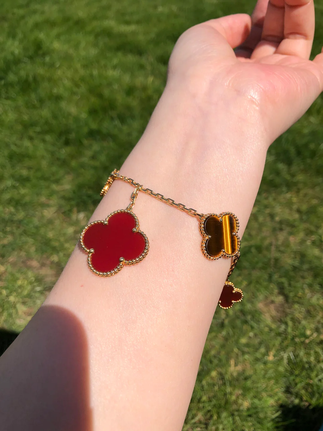 The Magic Alhambra bracelet reinterprets the Maison’s iconic four-leaf motif through a harmonious play of contrasting sizes. With five motifs arranged in an elegant asymmetric sequence, the piece expresses freedom, movement, and refined imagination.