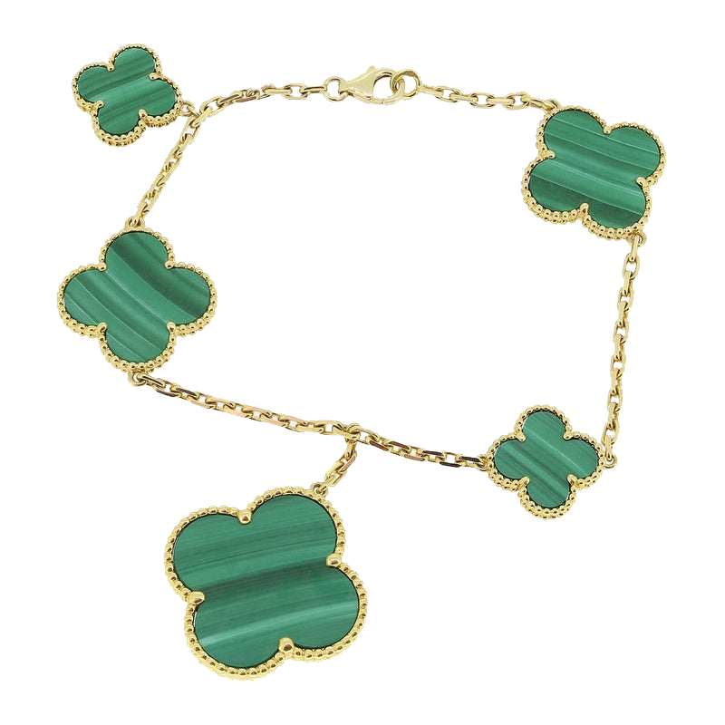 The Magic Alhambra bracelet reinterprets the Maison’s iconic four-leaf motif through a harmonious play of contrasting sizes. With five motifs arranged in an elegant asymmetric sequence, the piece expresses freedom, movement, and refined imagination.