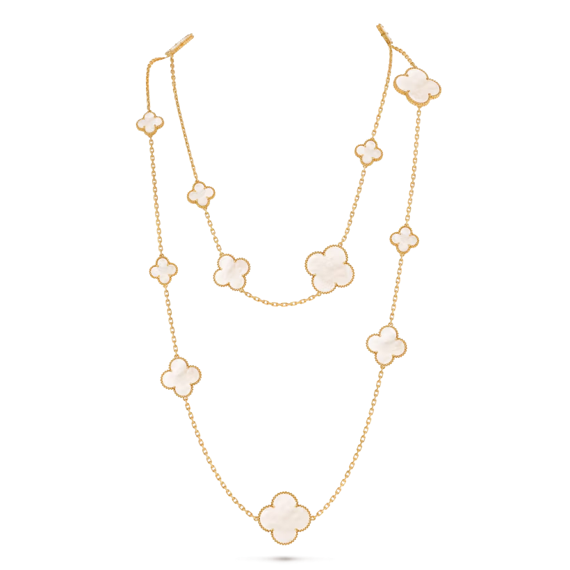 The Magic Alhambra long necklace features sixteen signature four-leaf clover motifs crafted from natural materials and framed with delicate 18K gold beaded edges. This piece symbolizes luck, elegance, and timeless craftsmanship.