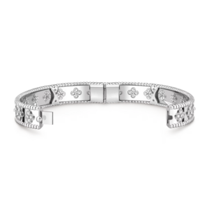 Designed to sit comfortably on the wrist, the bracelet moves fluidly with the wearer. Its bold design makes it ideal as a standalone statement, while its refined lines allow it to be easily layered with other Perlée or Alhambra creations for a more expressive look.