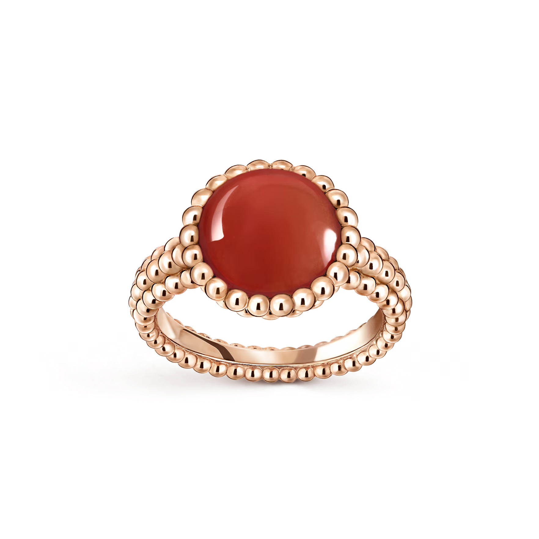 The 18K rose gold with carnelian version offers a warm, passionate glow. Carnelian’s vibrant red-orange hue radiates energy and optimism, beautifully contrasted by the soft, feminine blush of rose gold. The surrounding golden pearls add dimension and light, framing the stone with exceptional craftsmanship.