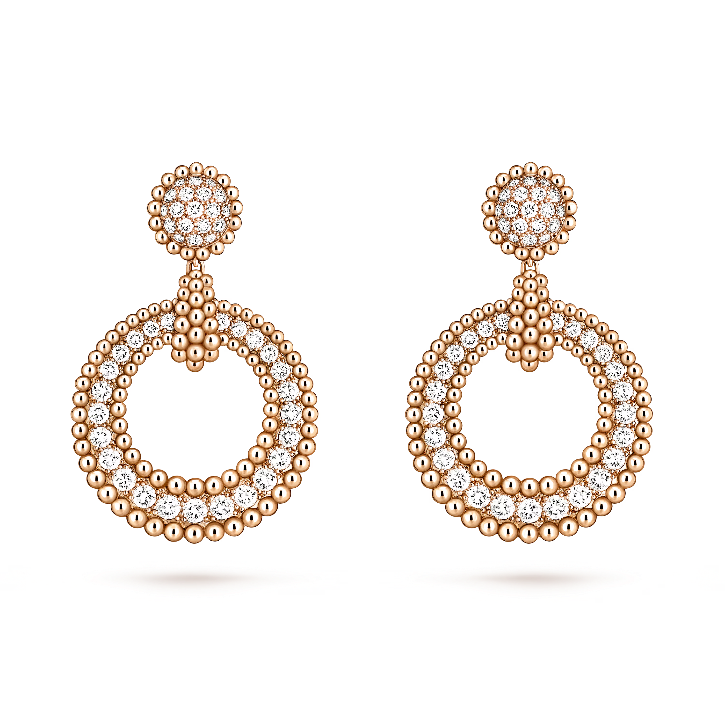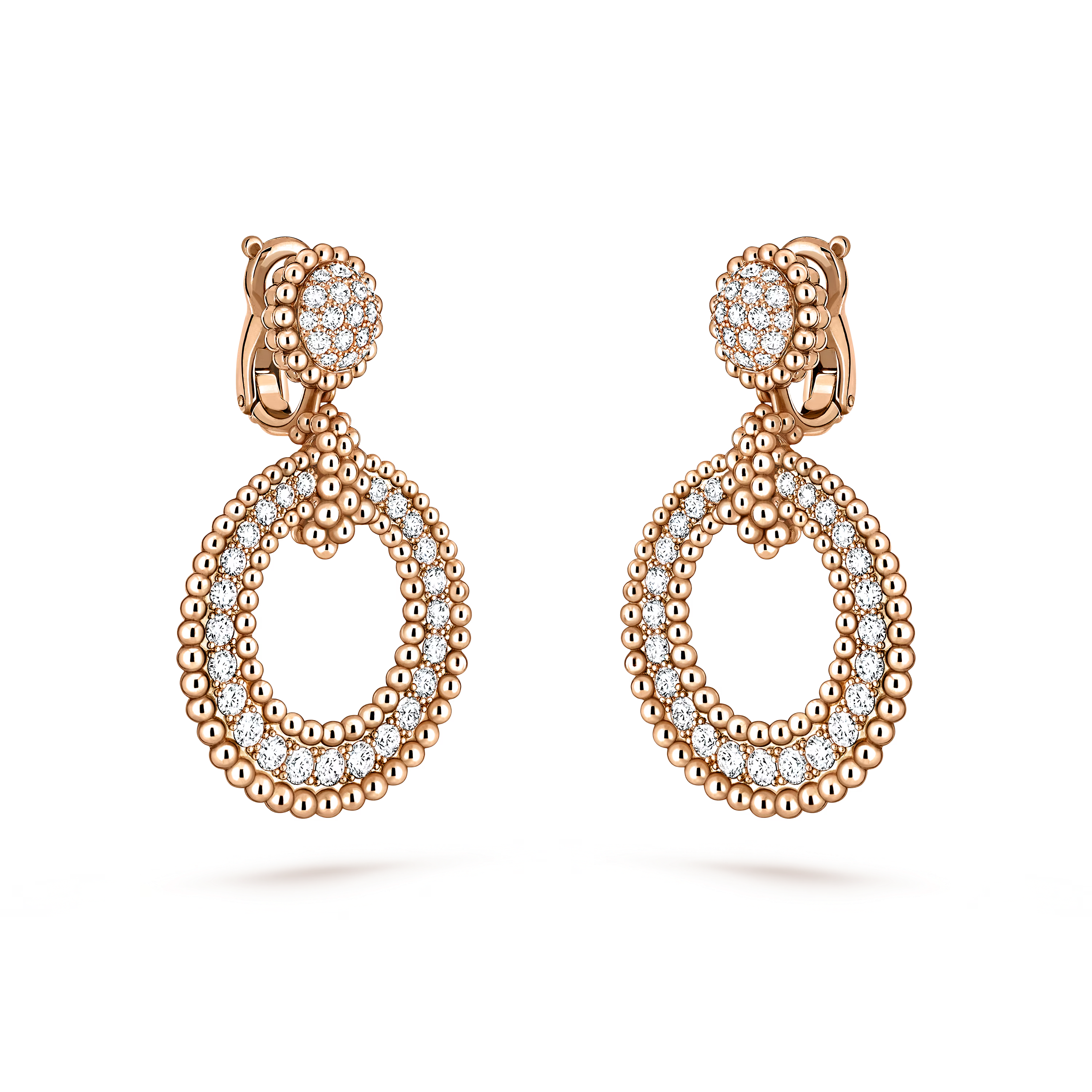 Each earring is crafted in 18K gold and adorned with a row of carefully selected brilliant-cut diamonds, meticulously set to enhance their sparkle and depth. The iconic beaded contour adds tactile elegance and a subtle shimmer, highlighting Van Cleef & Arpels’ dedication to artisanal perfection.
