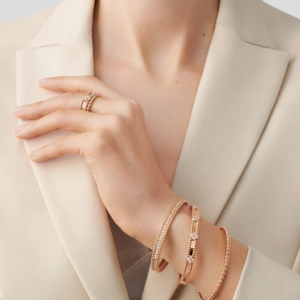 The Perlée sweet clovers bracelet, medium model, celebrates the Maison’s poetic elegance through a luminous blend of 18K rose gold and sparkling diamonds. Gentle, feminine, and refined, this creation highlights the joyful spirit of the Perlée collection with a fresh, modern charm.