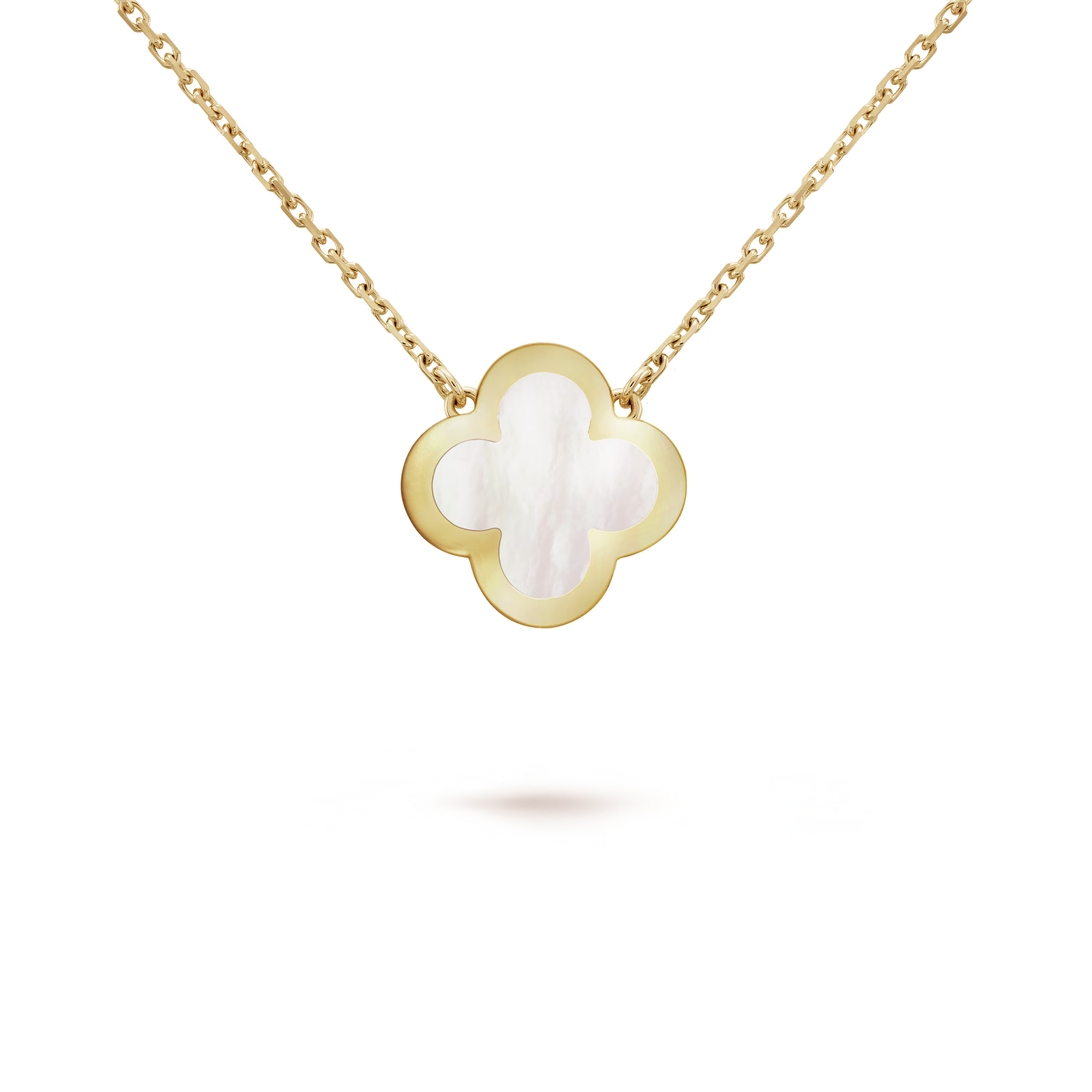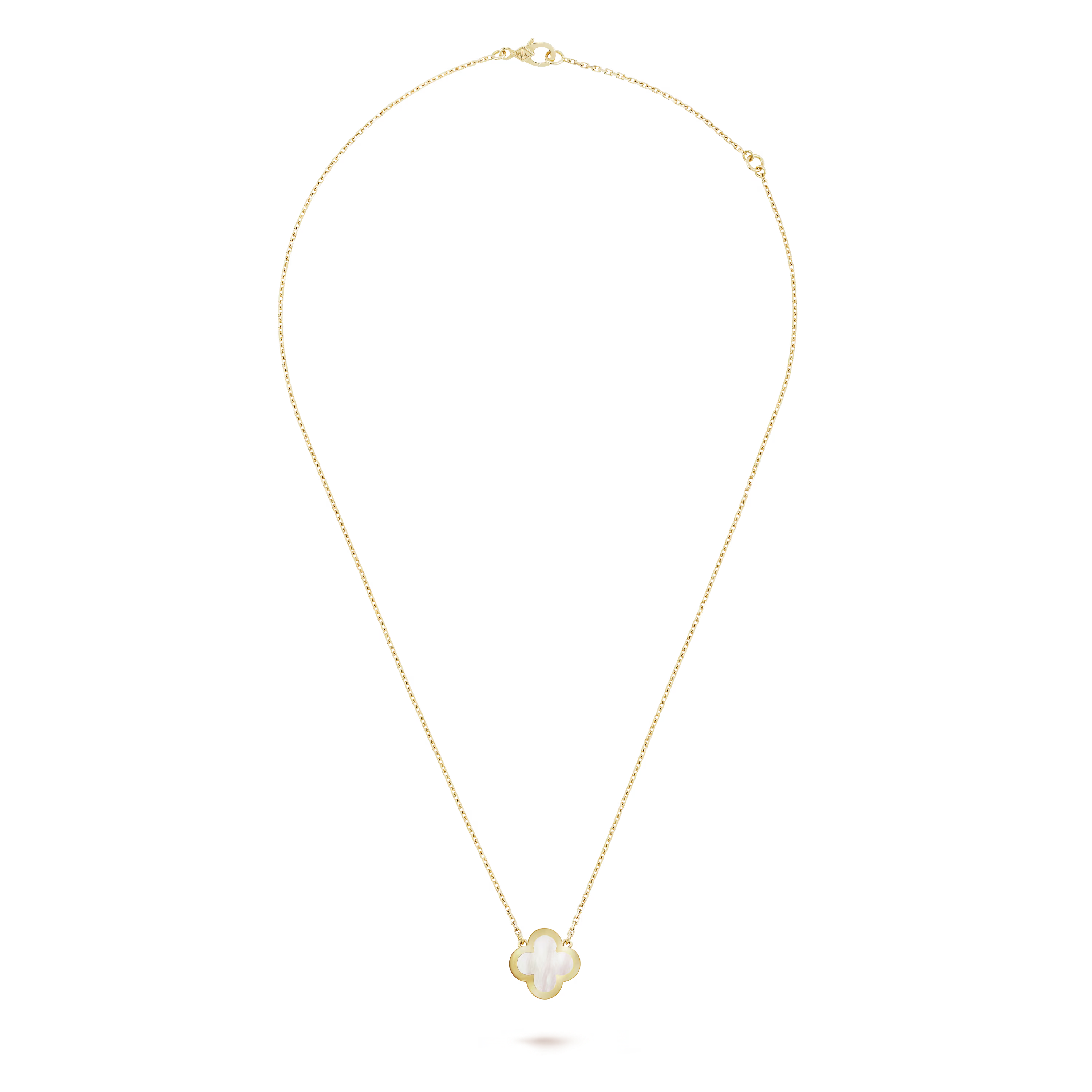 Suspended from a matching yellow-gold chain, the pendant rests softly along the neckline, making it ideal for daily wear or refined occasions. Whether worn alone or paired with other Alhambra pieces, it brings a sense of grace, purity, and quiet luxury.