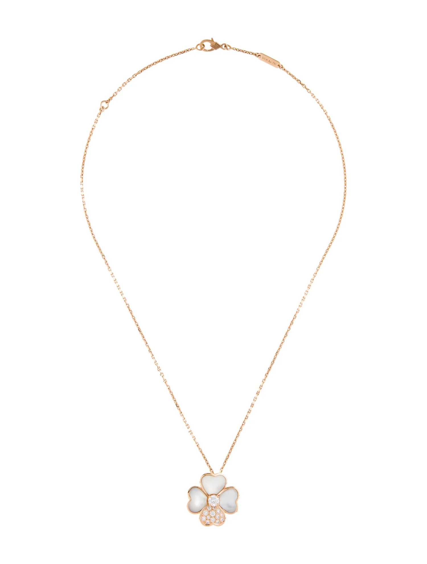 The four harmonious petals are crafted from exceptional mother-of-pearl, selected for its soft iridescent glow and natural purity. At the heart of the flower, a sparkling diamond brings a burst of light, enhancing the pendant’s gentle curves and three-dimensional relief. The Maison’s meticulous craftsmanship ensures each petal reflects a perfect balance of volume, texture, and shine.
