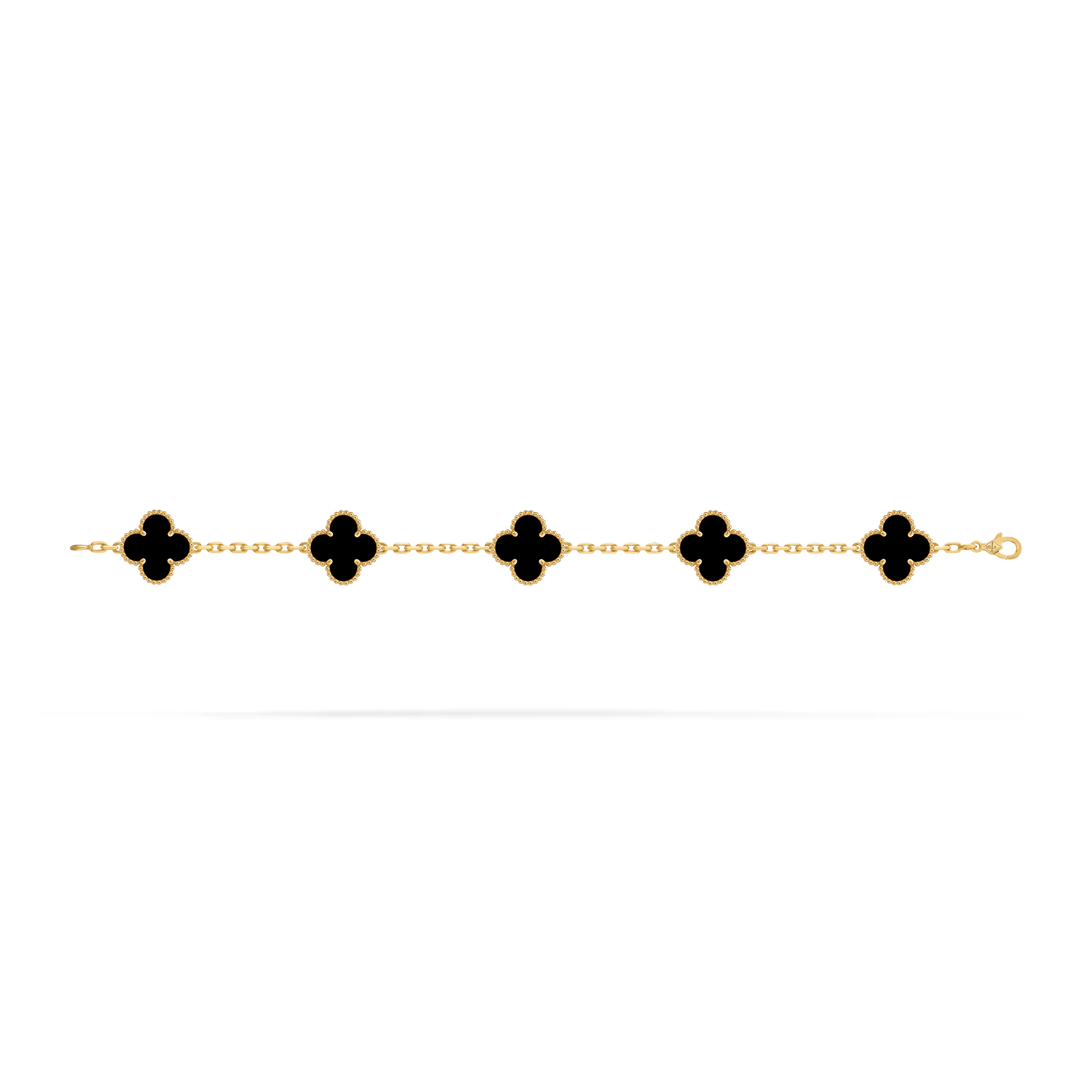 This bracelet features five Vintage Alhambra motifs, evenly spaced along the chain. The symmetrical arrangement creates a refined rhythm and balanced silhouette on the wrist, reflecting classic proportions and understated sophistication.