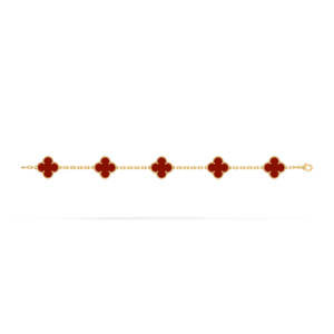 This bracelet features five Vintage Alhambra motifs, evenly spaced along the chain. The symmetrical composition creates a balanced and elegant rhythm on the wrist, highlighting the purity of the original design.