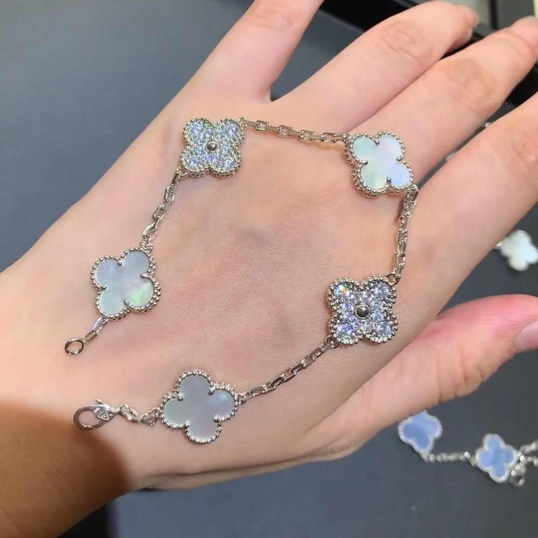 Each four-leaf clover motif is framed by the collection’s iconic beaded edge. This distinctive detail adds depth, texture, and a sculptural dimension, enhancing the bracelet’s instantly recognizable character.