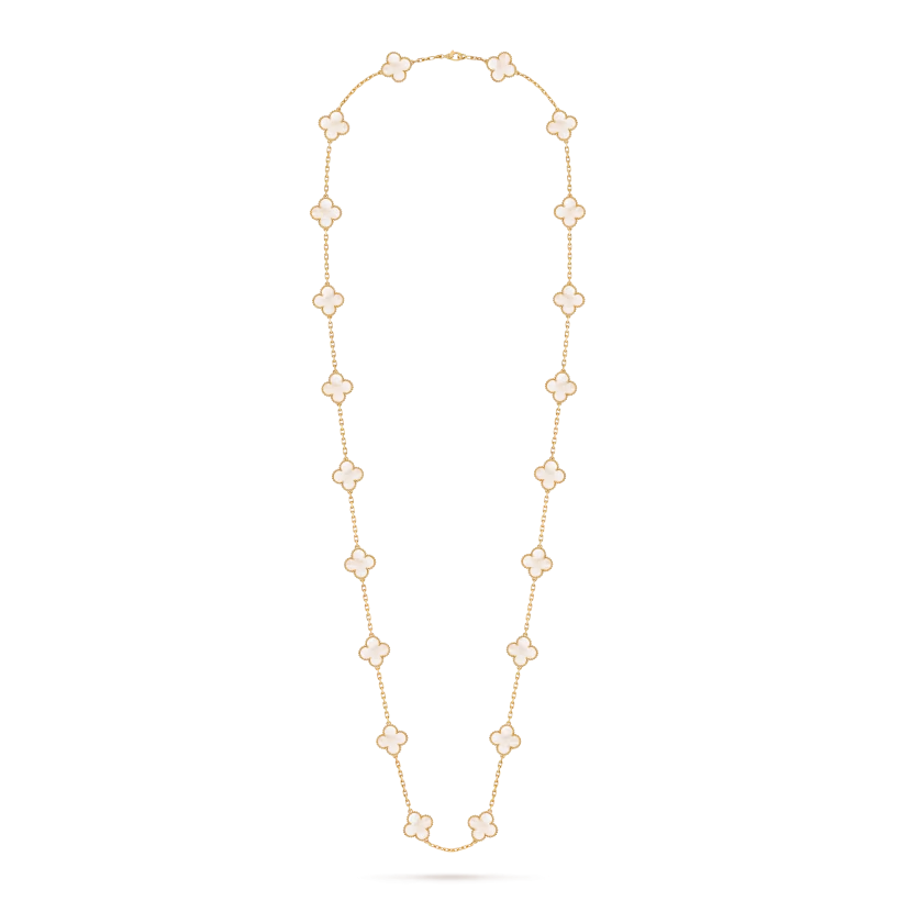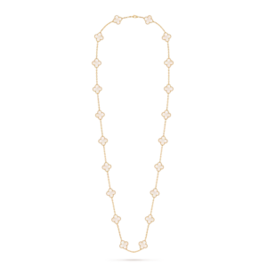 The Vintage Alhambra long necklace showcases twenty iconic clover motifs symbolizing luck and timeless elegance. Each motif is crafted from natural materials and framed by delicate beaded 18K gold edges, creating a harmonious and recognizable silhouette.