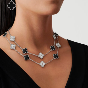 The Vintage Alhambra long necklace with 20 motifs combines iconic design, natural materials, and expert craftsmanship. It is a timeless accessory that embodies elegance and good fortune.