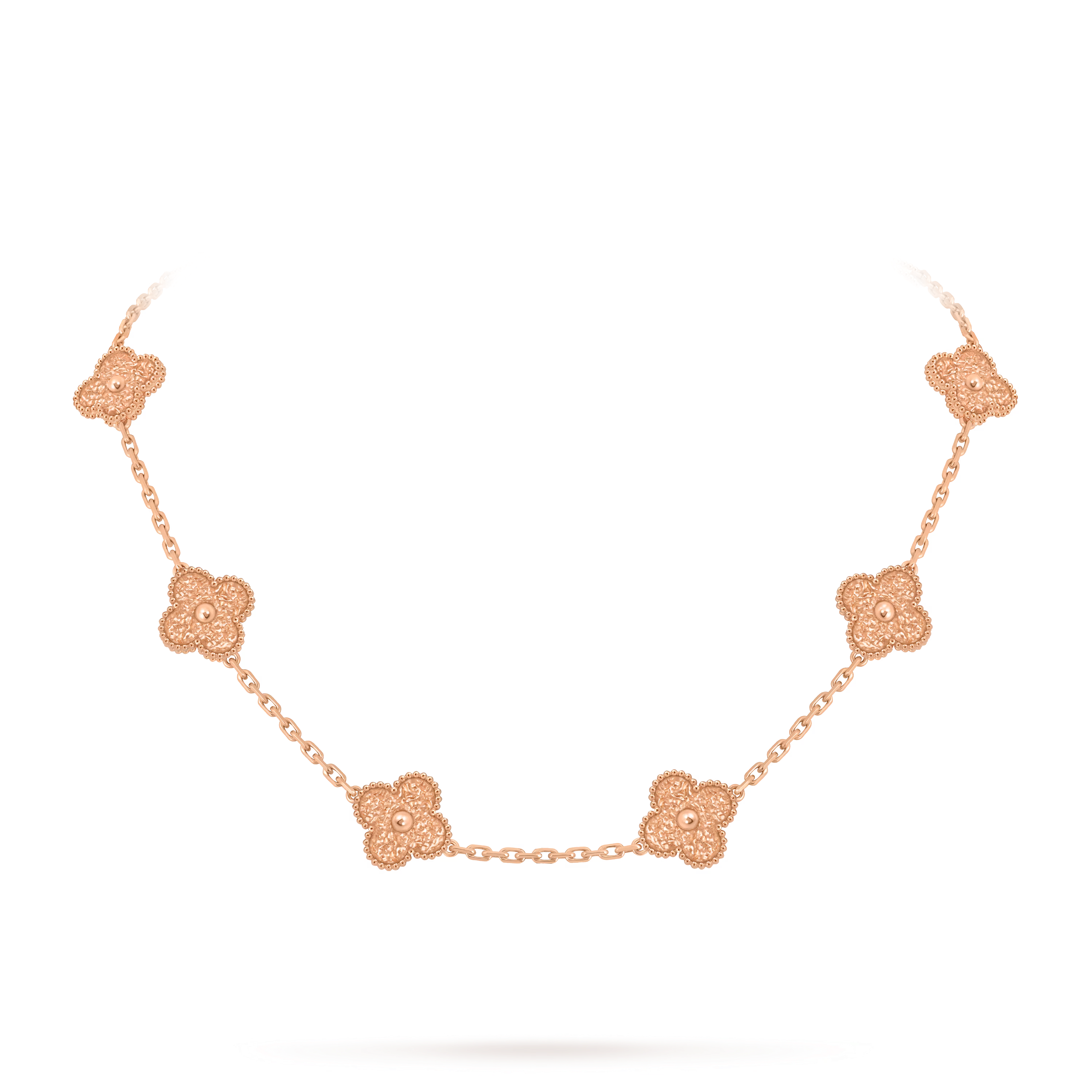 Perfect for pairing with other Alhambra creations or wearing alone as a symbol of luck and beauty, this necklace captures the Maison’s enduring vision of grace, harmony, and timeless elegance.