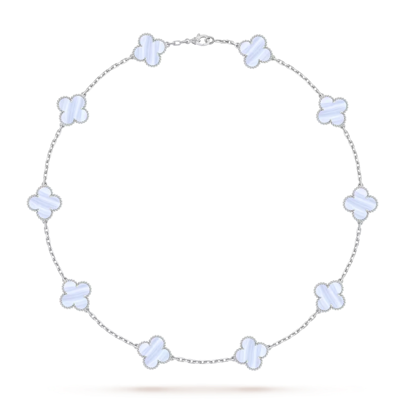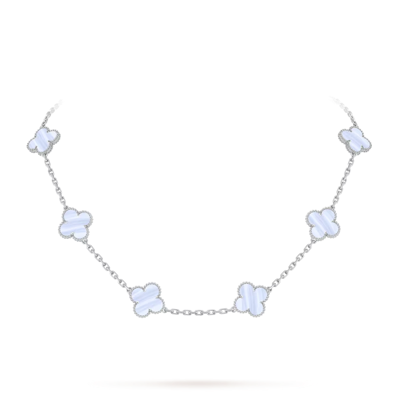 The Vintage Alhambra necklace features ten iconic four-leaf clover motifs crafted from natural materials and framed with delicate 18K gold beaded edges. This design symbolizes luck, elegance, and timeless style.