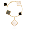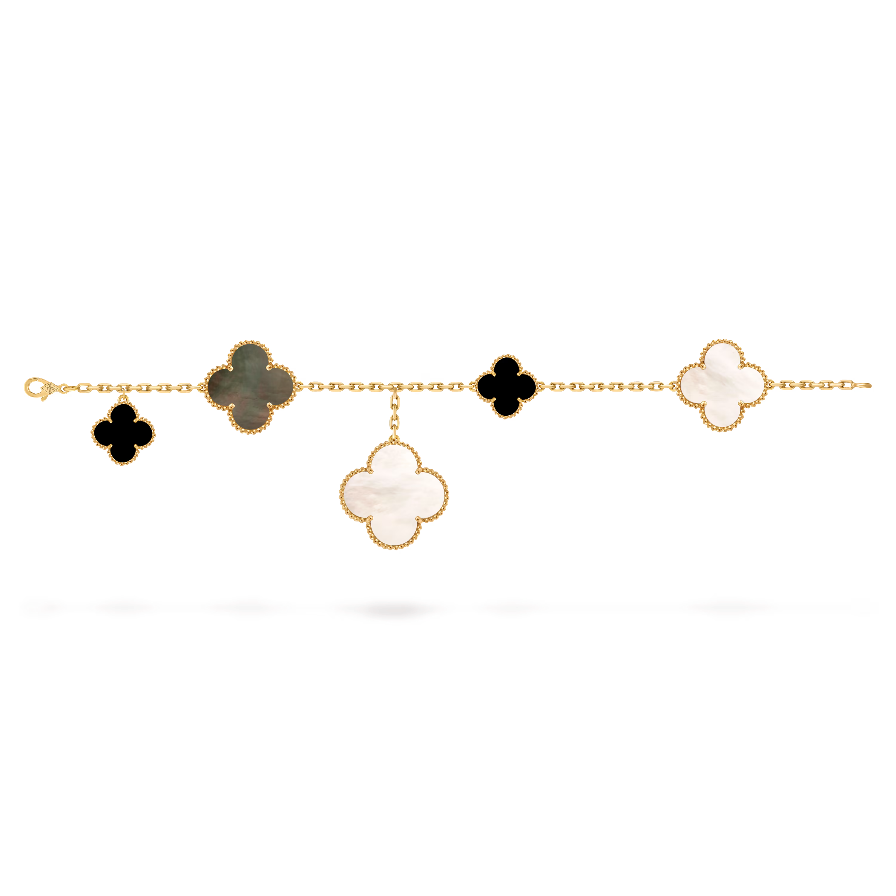 This bracelet features five Alhambra motifs of varying sizes, artfully arranged along the wrist. The asymmetrical composition creates a dynamic rhythm while maintaining visual balance, resulting in a refined yet expressive silhouette.