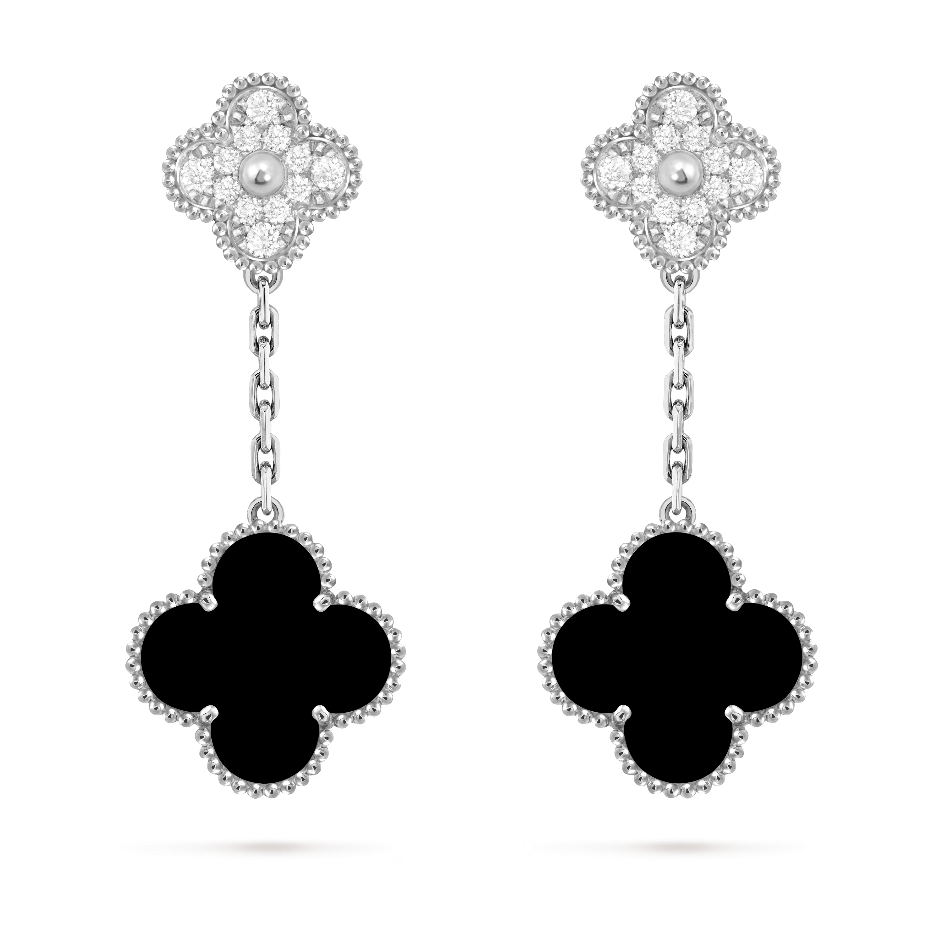 Crafted in radiant 18K gold, each motif is framed by the signature hand-polished beaded contour, a hallmark of Van Cleef & Arpels’ exceptional craftsmanship. The motifs are set with carefully selected natural stones — prized for their depth, iridescence, and unique character — enhancing the earrings’ refined harmony and timeless charm.