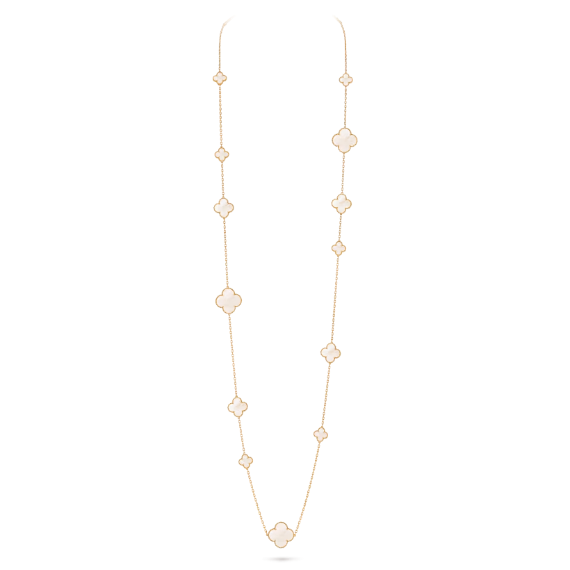 The Magic Alhambra long necklace features sixteen signature four-leaf clover motifs crafted from natural materials and framed with delicate 18K gold beaded edges. This piece symbolizes luck, elegance, and timeless craftsmanship.