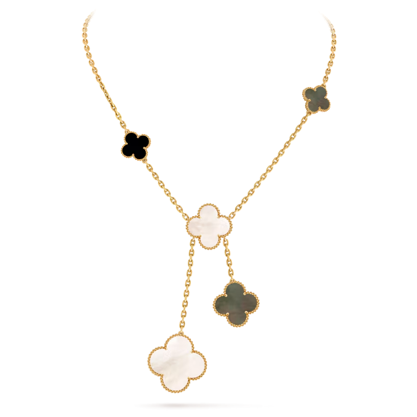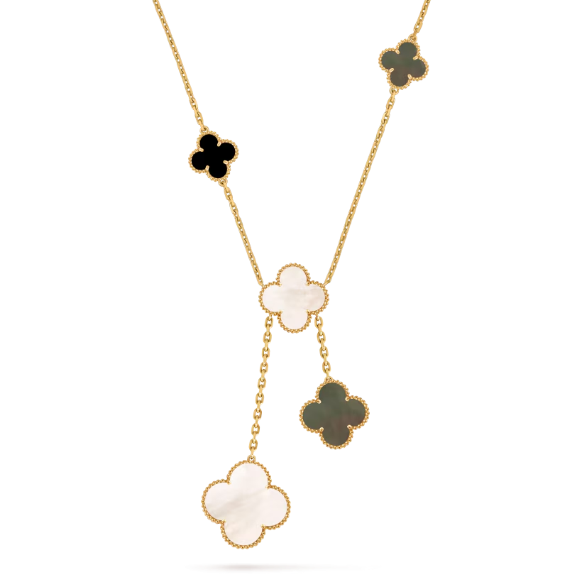 The Magic Alhambra necklace features six signature four-leaf clover motifs crafted from natural materials and framed with delicate 18K gold beaded edges. The design symbolizes luck, elegance, and timeless craftsmanship.