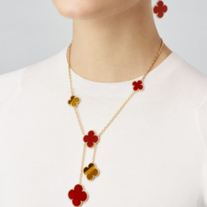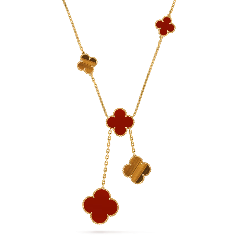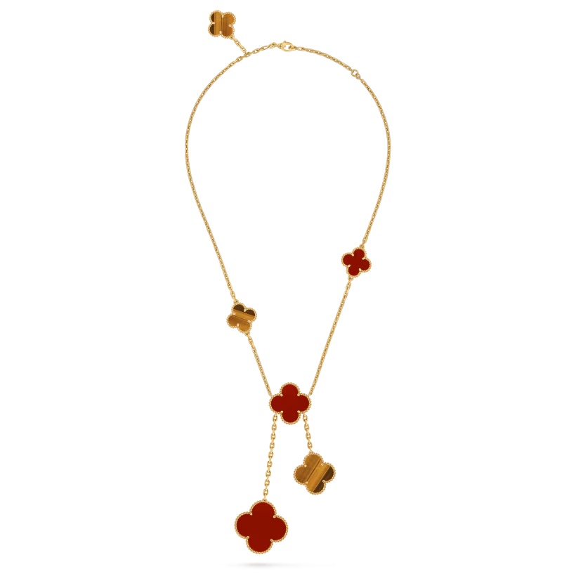 The Magic Alhambra necklace features six iconic four-leaf clover motifs crafted from natural materials and framed with delicate 18K gold beaded edges. This design represents luck, elegance, and timeless Van Cleef & Arpels craftsmanship.