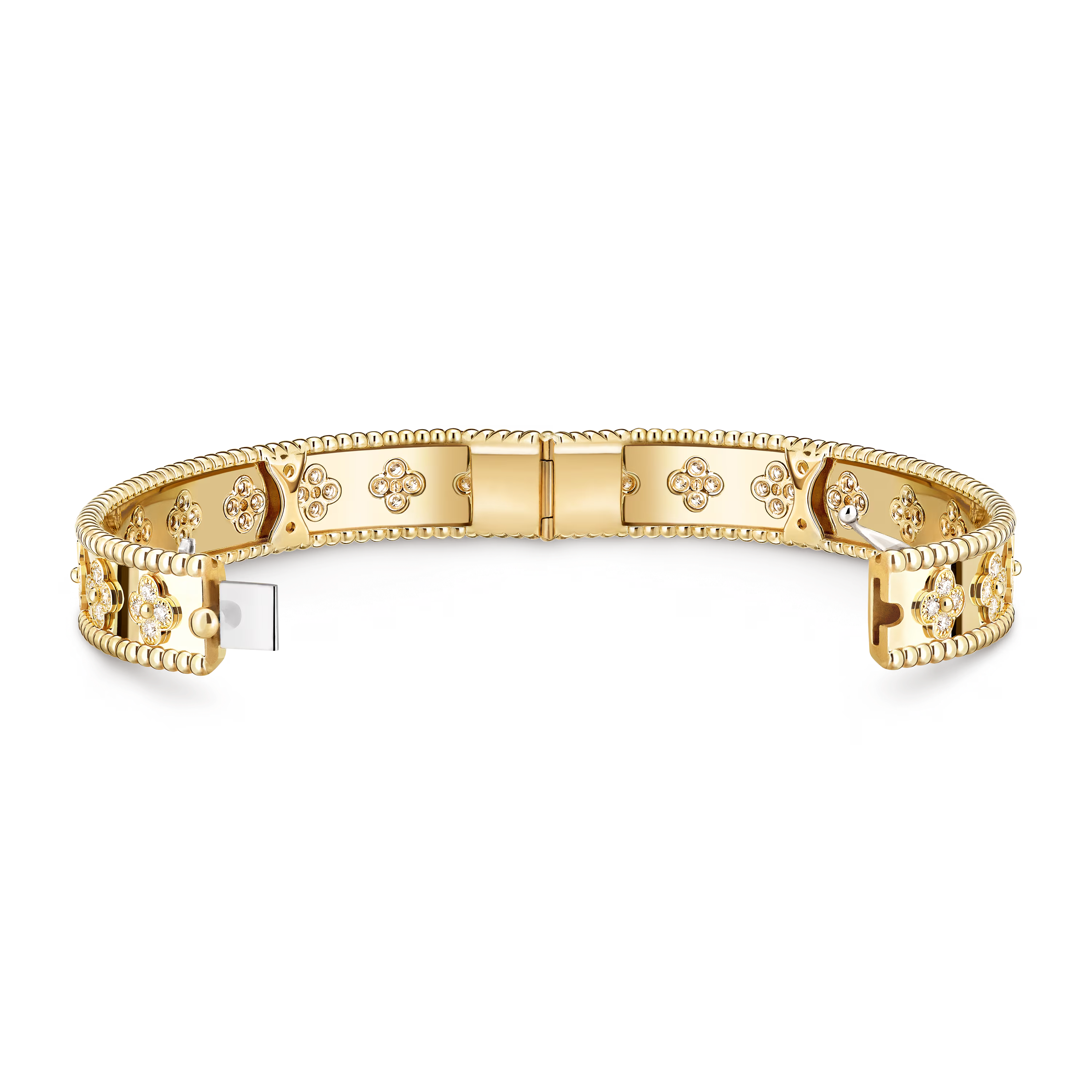 The Perlée clovers bracelet, medium model, embodies the Maison’s spirit of brilliance and refinement. Playful yet sophisticated, this radiant creation unites the iconic clover motif with the luminous Perlée golden bead aesthetic, offering a joyful interpretation of luck and artistry.