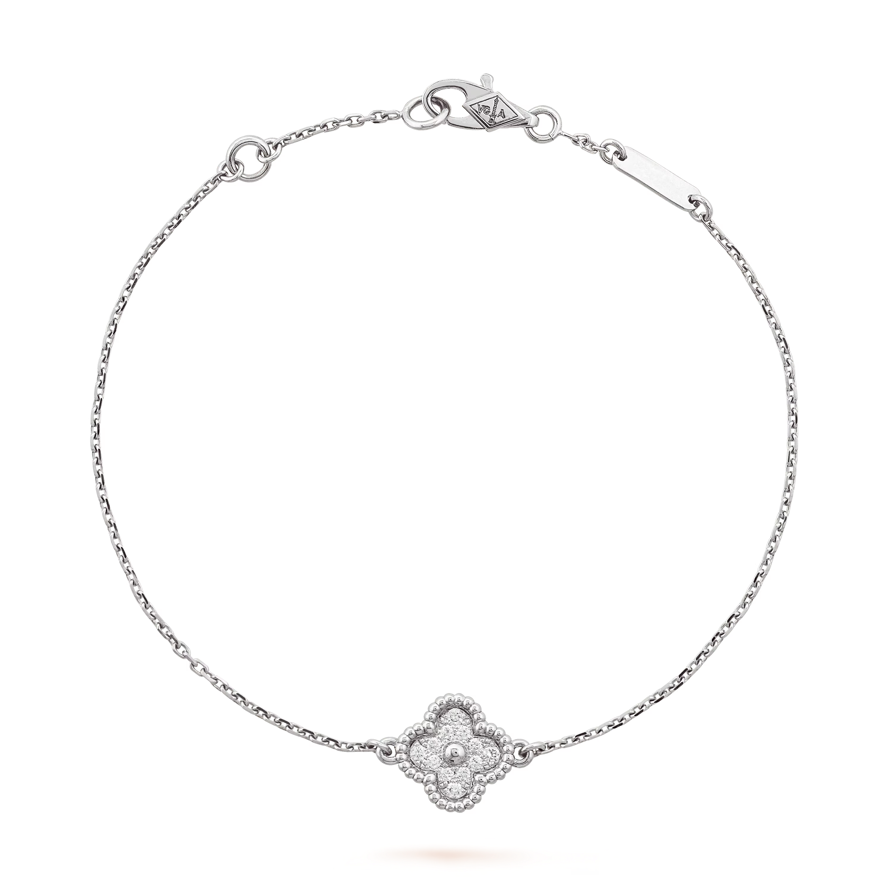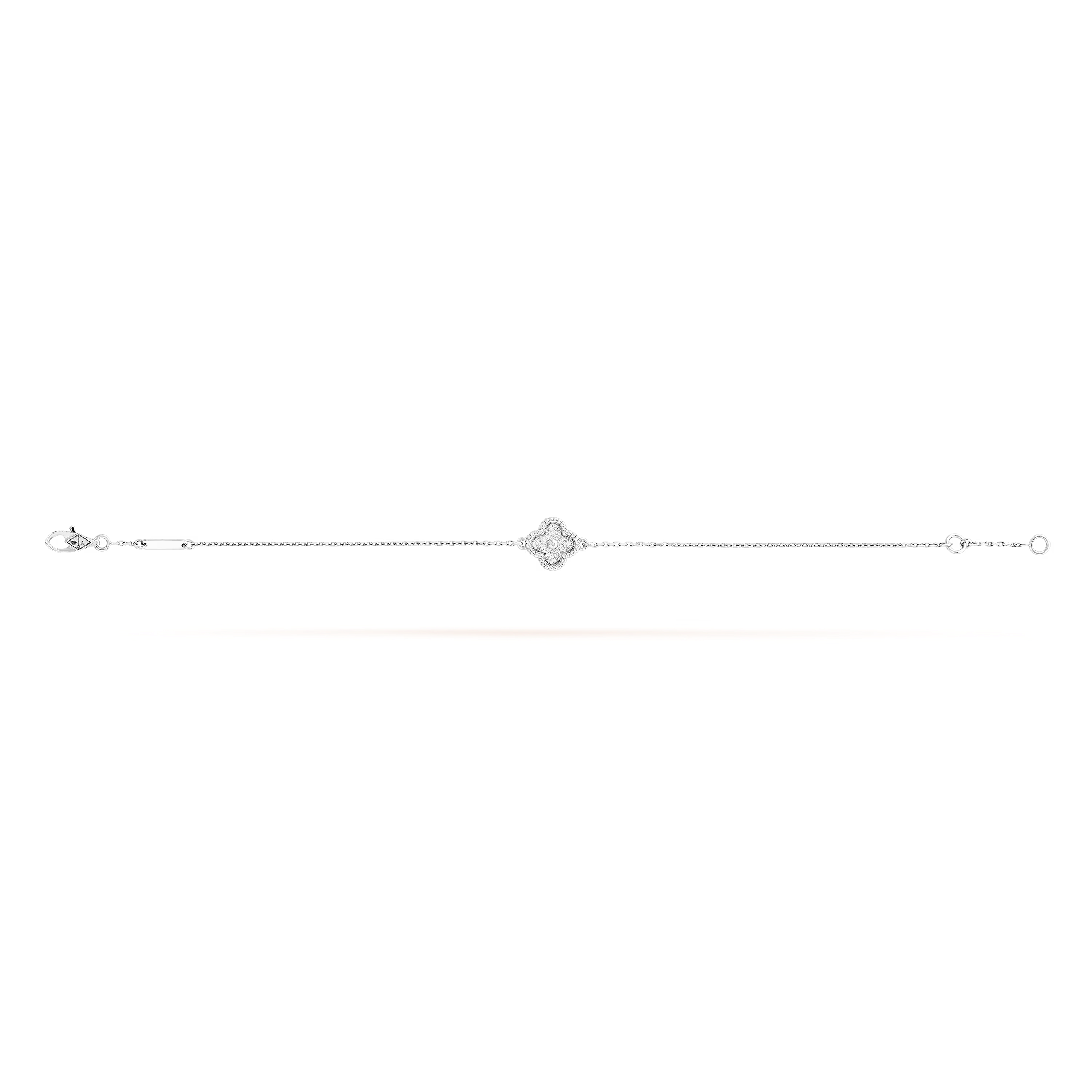 This bracelet features a single Sweet Alhambra motif centered along a fine chain. The restrained composition highlights the purity of the design, allowing the iconic clover to take center stage with understated charm.