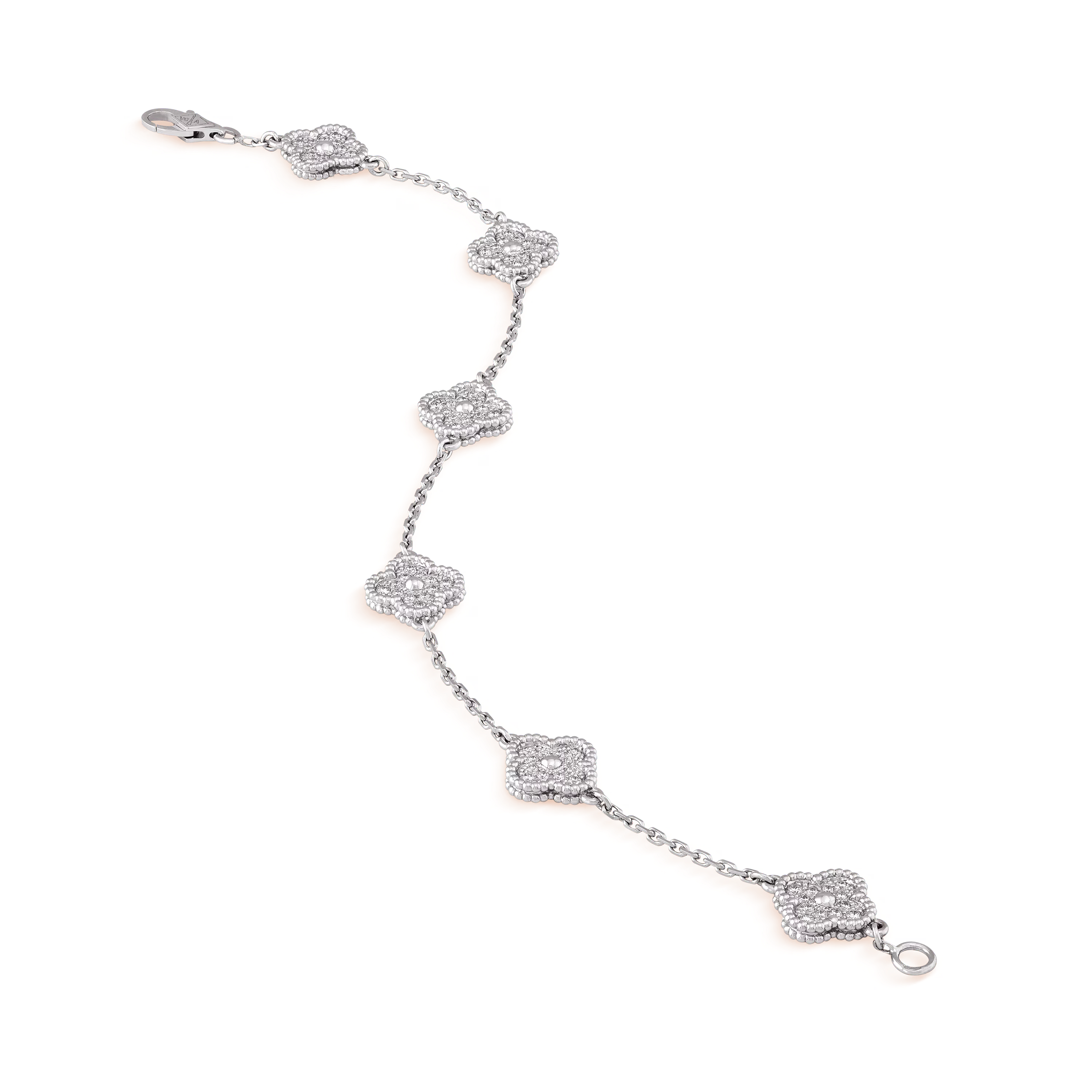 This bracelet features six Sweet Alhambra motifs, gracefully arranged along a fine chain. The repeating clover design creates a refined rhythm on the wrist, offering a subtle yet expressive presence.