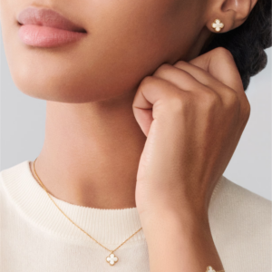 Available in 18K yellow gold or 18K white gold, each mini motif is inlaid with luminous mother-of-pearl, carefully selected for its natural iridescence and purity. The signature hand-polished beaded contour frames each motif, enhancing its soft glow and reflecting Van Cleef & Arpels’ meticulous craftsmanship.