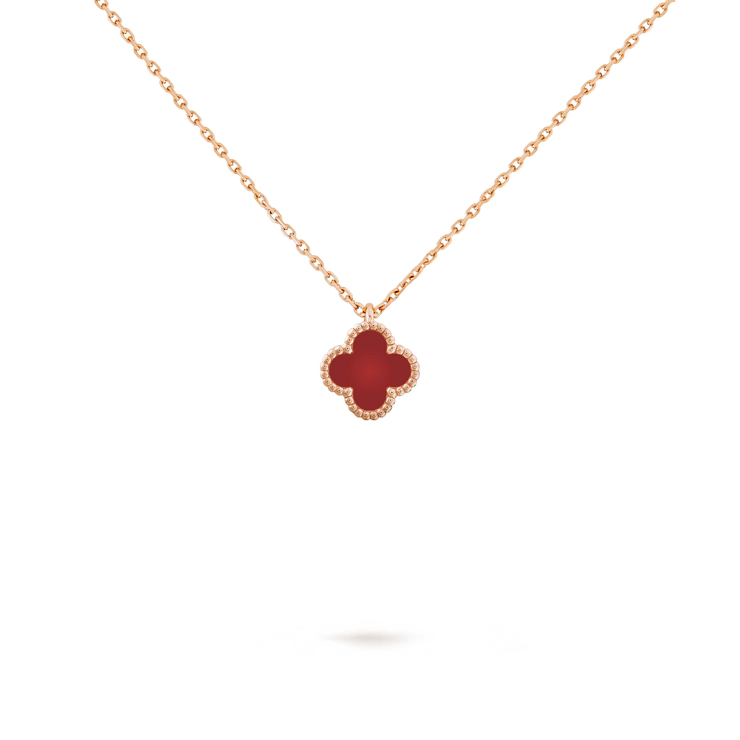 Delicate, joyful, and full of symbolic charm, the Sweet Alhambra Pendant Mini embodies the essence of Van Cleef & Arpels’ timeless clover design. Crafted in warm 18K rose gold, this pendant features a vibrant carnelian stone at its center, capturing the Maison’s poetic celebration of luck, beauty, and craftsmanship.