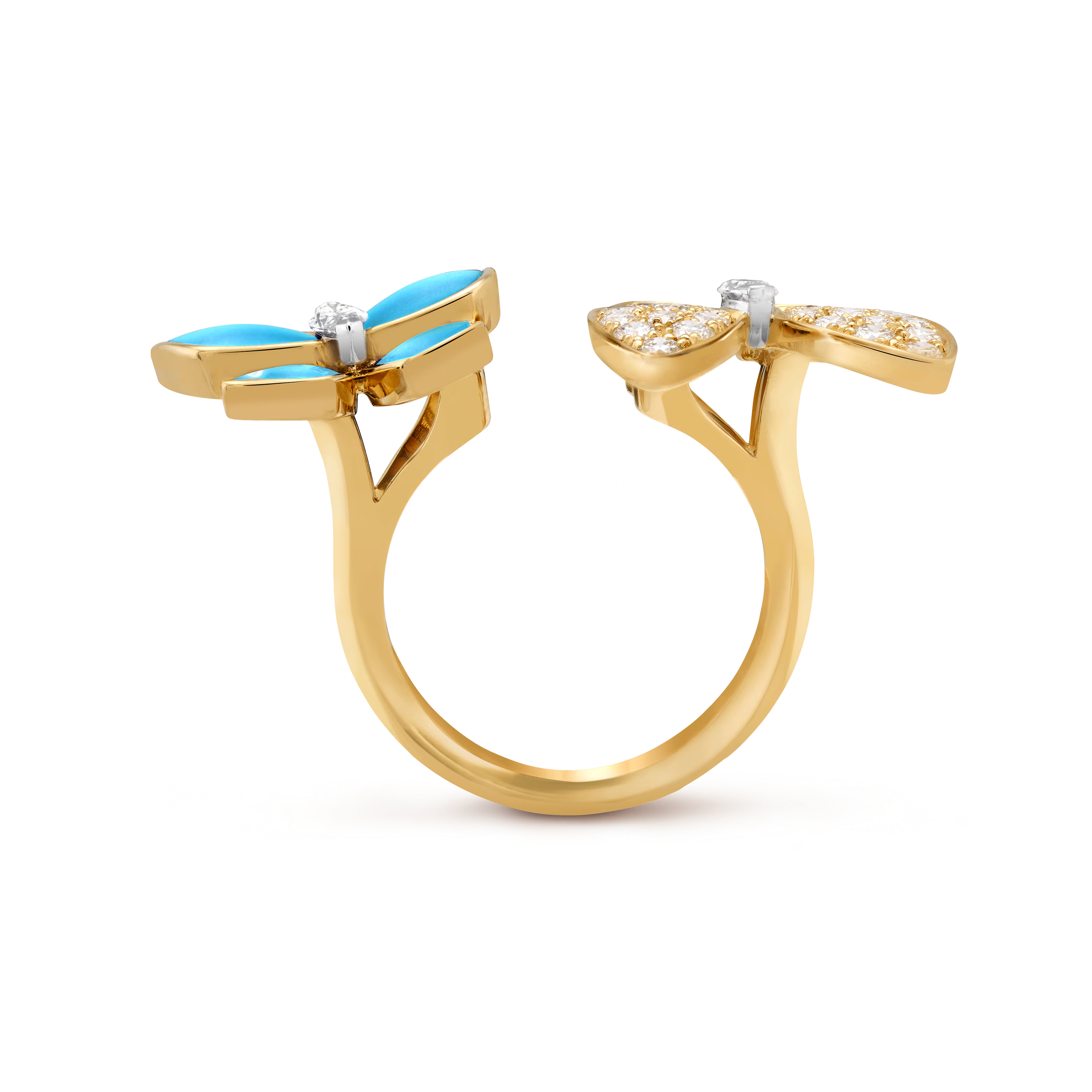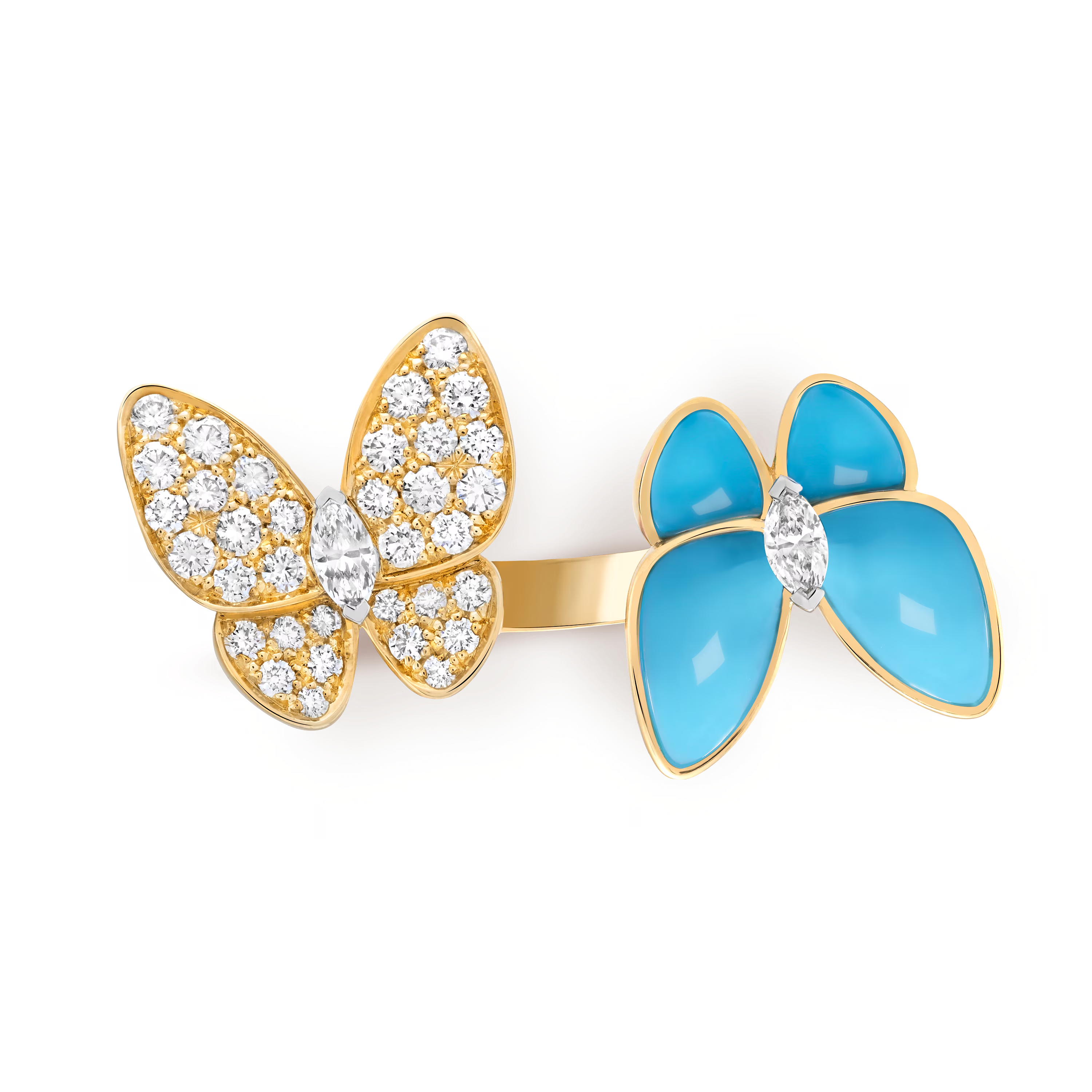 One butterfly is adorned with vivid turquoise, its striking blue tone recalling clear skies and serene horizons. Smooth and radiant, the stone’s natural beauty offers a joyful contrast to the warm gold. The second butterfly shimmers with brilliant diamonds, carefully set to trace its delicate wings and capture the light with every gesture.