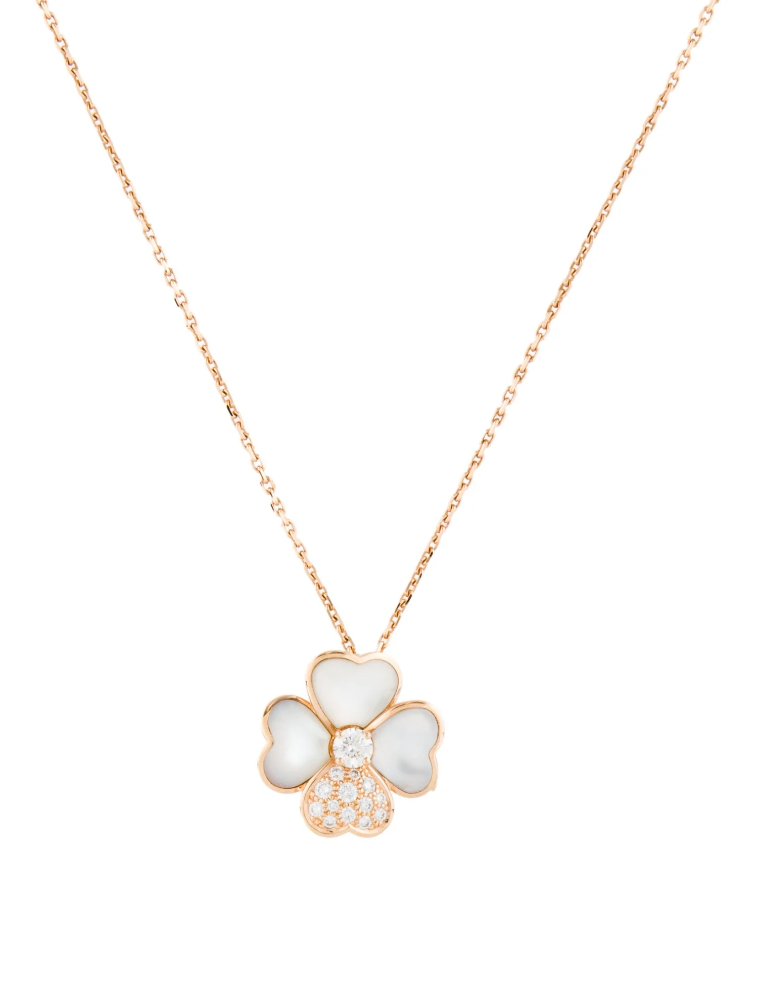 The four harmonious petals are crafted from exceptional mother-of-pearl, selected for its soft iridescent glow and natural purity. At the heart of the flower, a sparkling diamond brings a burst of light, enhancing the pendant’s gentle curves and three-dimensional relief. The Maison’s meticulous craftsmanship ensures each petal reflects a perfect balance of volume, texture, and shine.