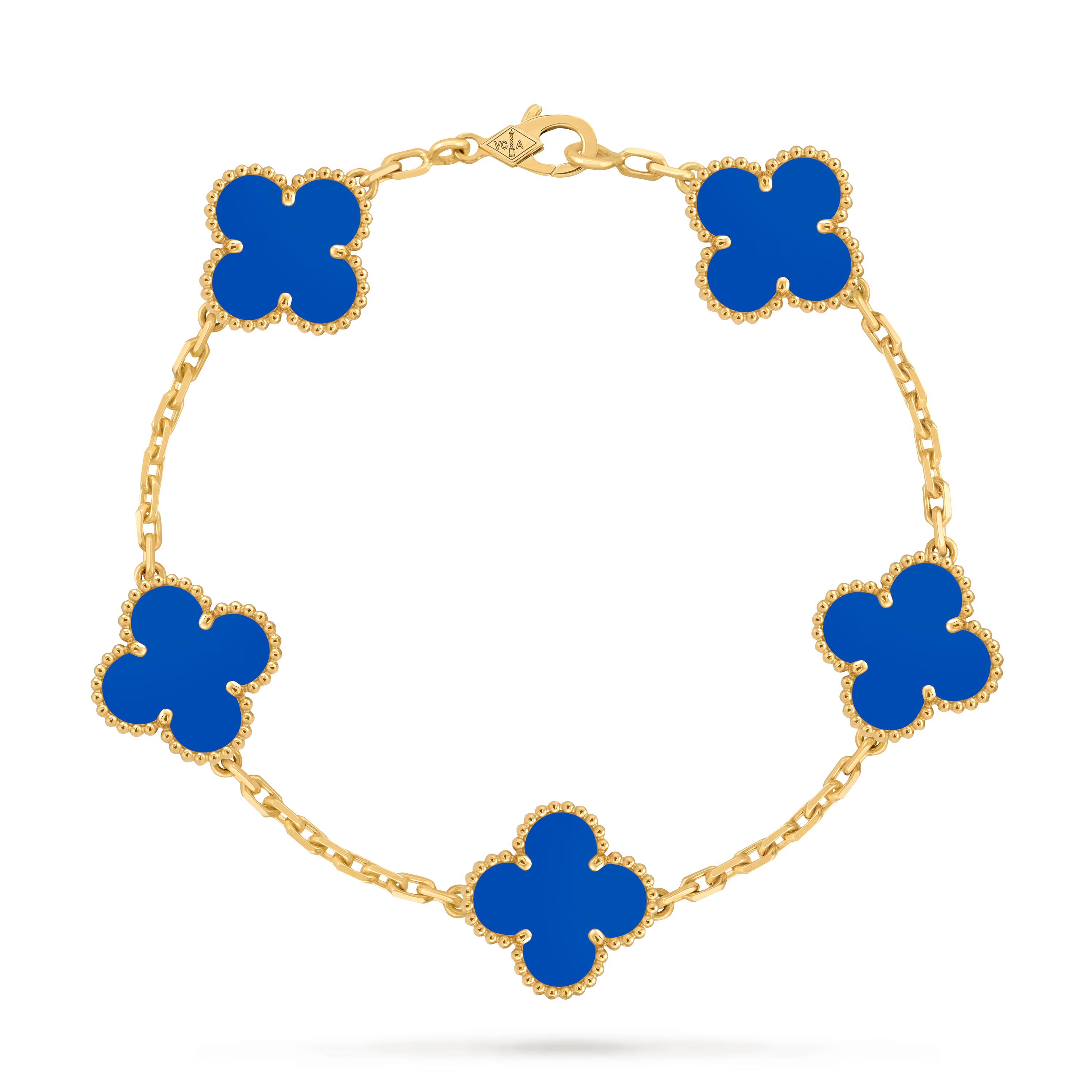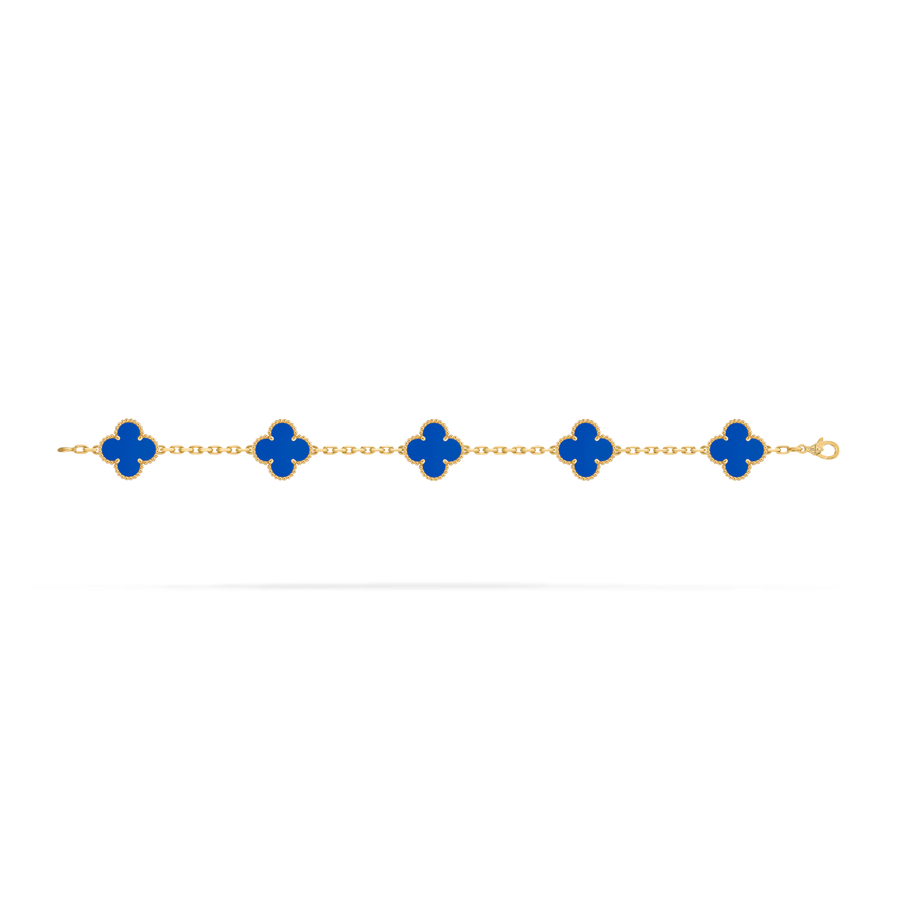 This bracelet features five Vintage Alhambra motifs, evenly spaced along the chain. The symmetrical composition creates a balanced and elegant rhythm on the wrist, highlighting the purity of the original design.