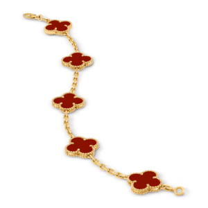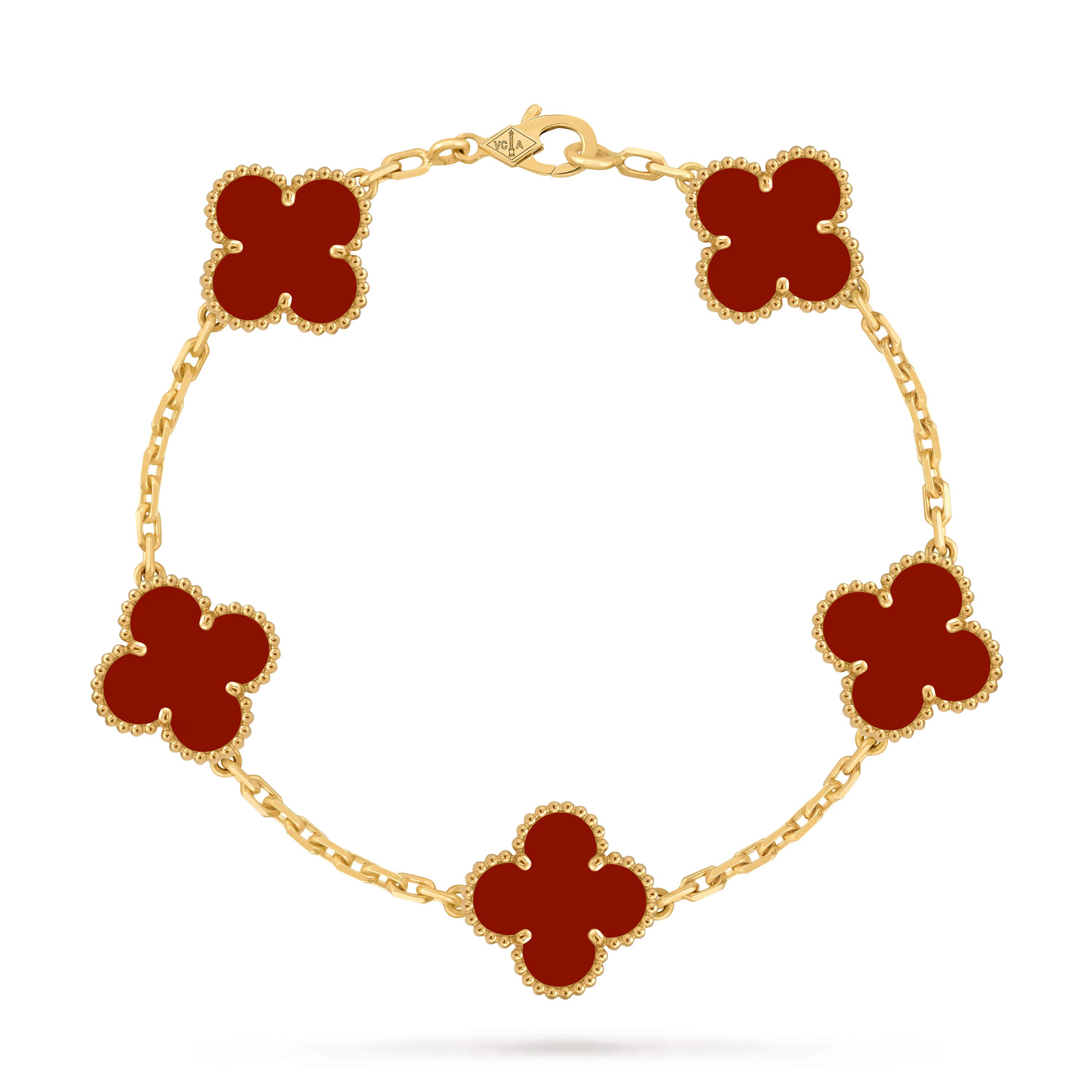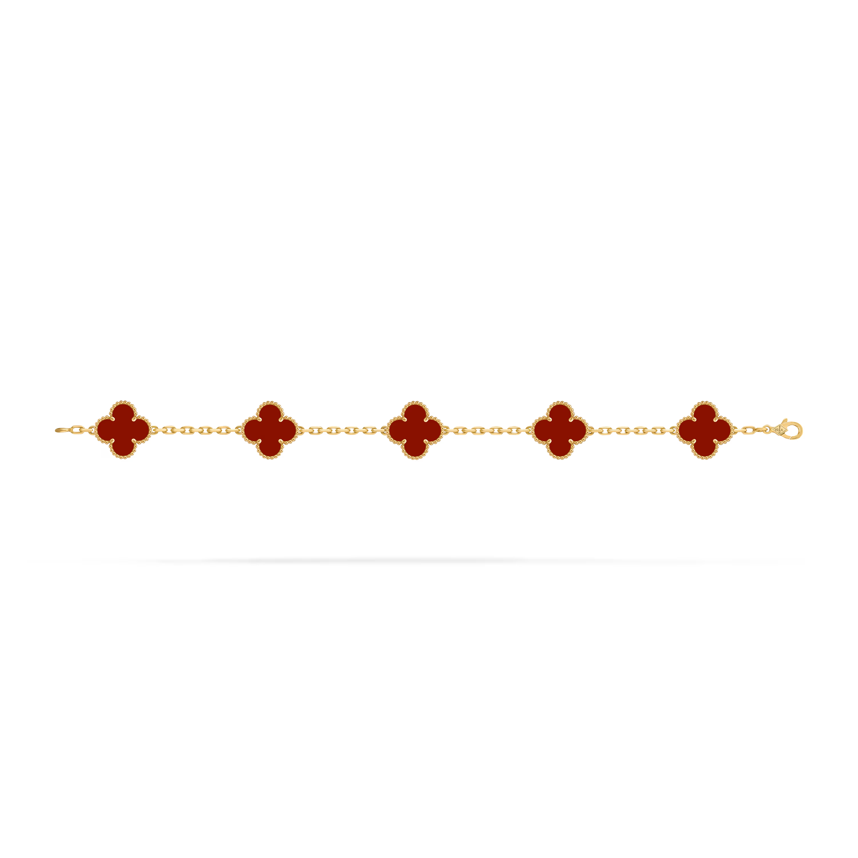 This bracelet features five Vintage Alhambra motifs, evenly spaced along the chain. The symmetrical composition creates a balanced and elegant rhythm on the wrist, highlighting the purity of the original design.