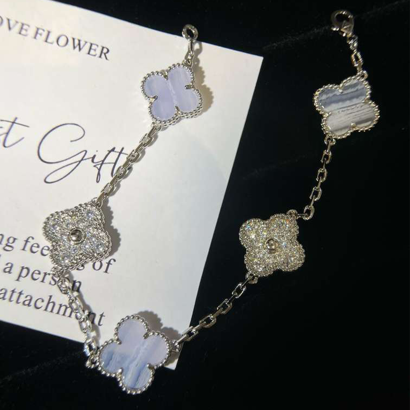 This bracelet features five Vintage Alhambra motifs, evenly spaced along the chain. The symmetrical composition creates a balanced and elegant rhythm on the wrist, highlighting the purity of the original design.