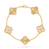 Each four-leaf clover motif is framed by the collection’s iconic beaded edge. This distinctive detail adds depth, texture, and a sculptural dimension, enhancing the bracelet’s instantly recognizable character.