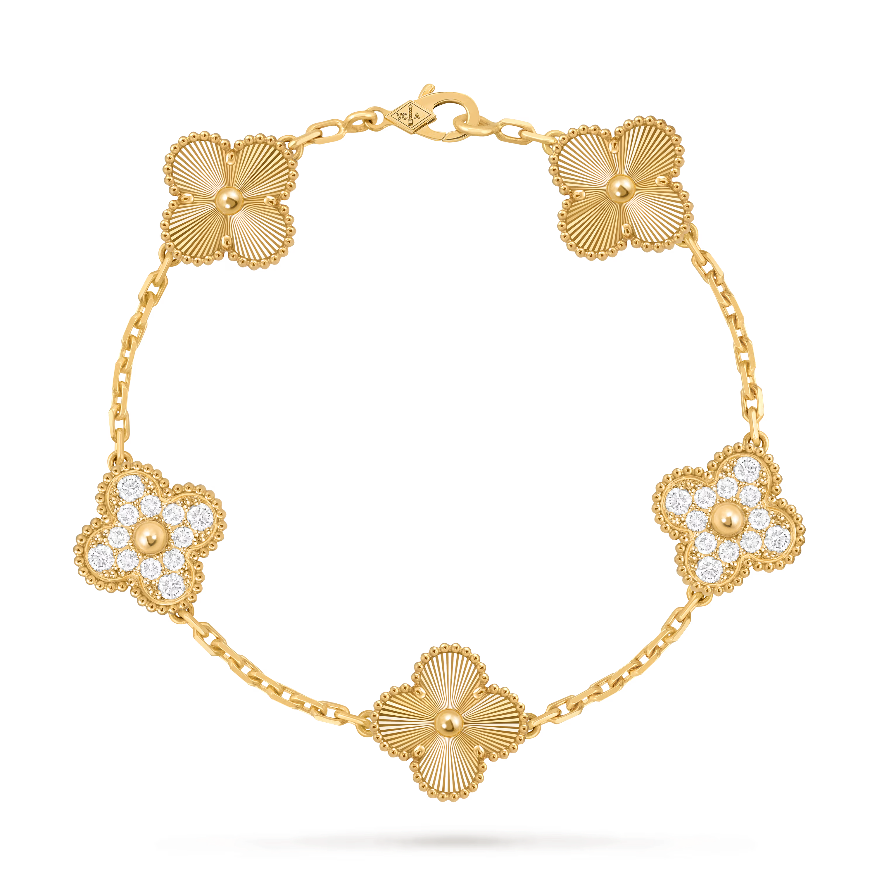 This bracelet features five Vintage Alhambra motifs, evenly spaced along the chain. The symmetrical composition creates a balanced and elegant rhythm on the wrist, highlighting the purity of the original design.