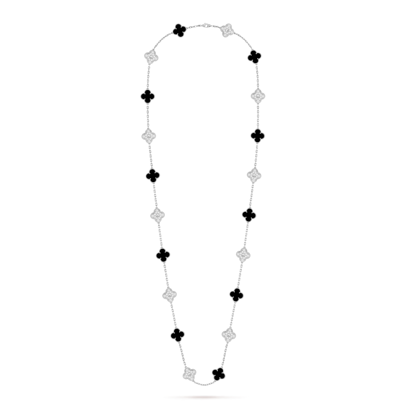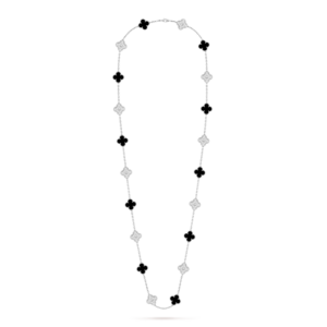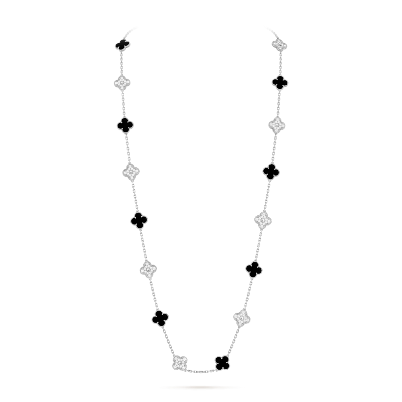 The Vintage Alhambra long necklace with 20 motifs combines iconic design, natural materials, and expert craftsmanship. It is a timeless accessory that embodies elegance and good fortune.