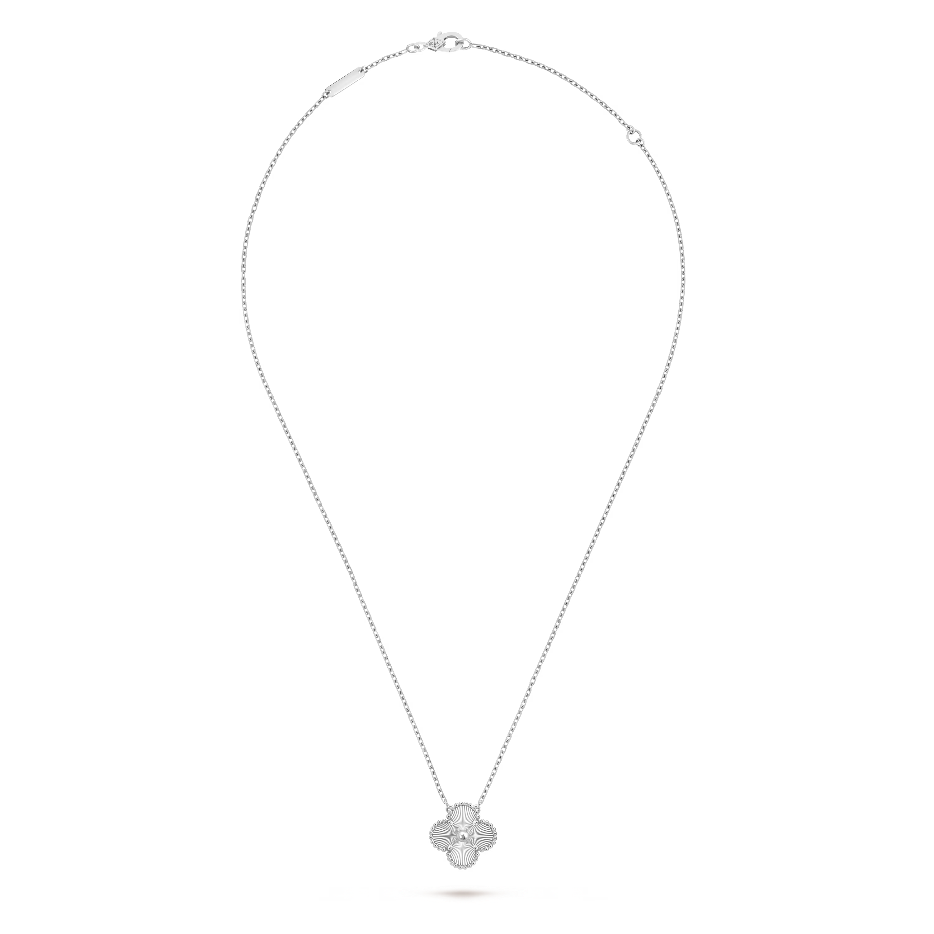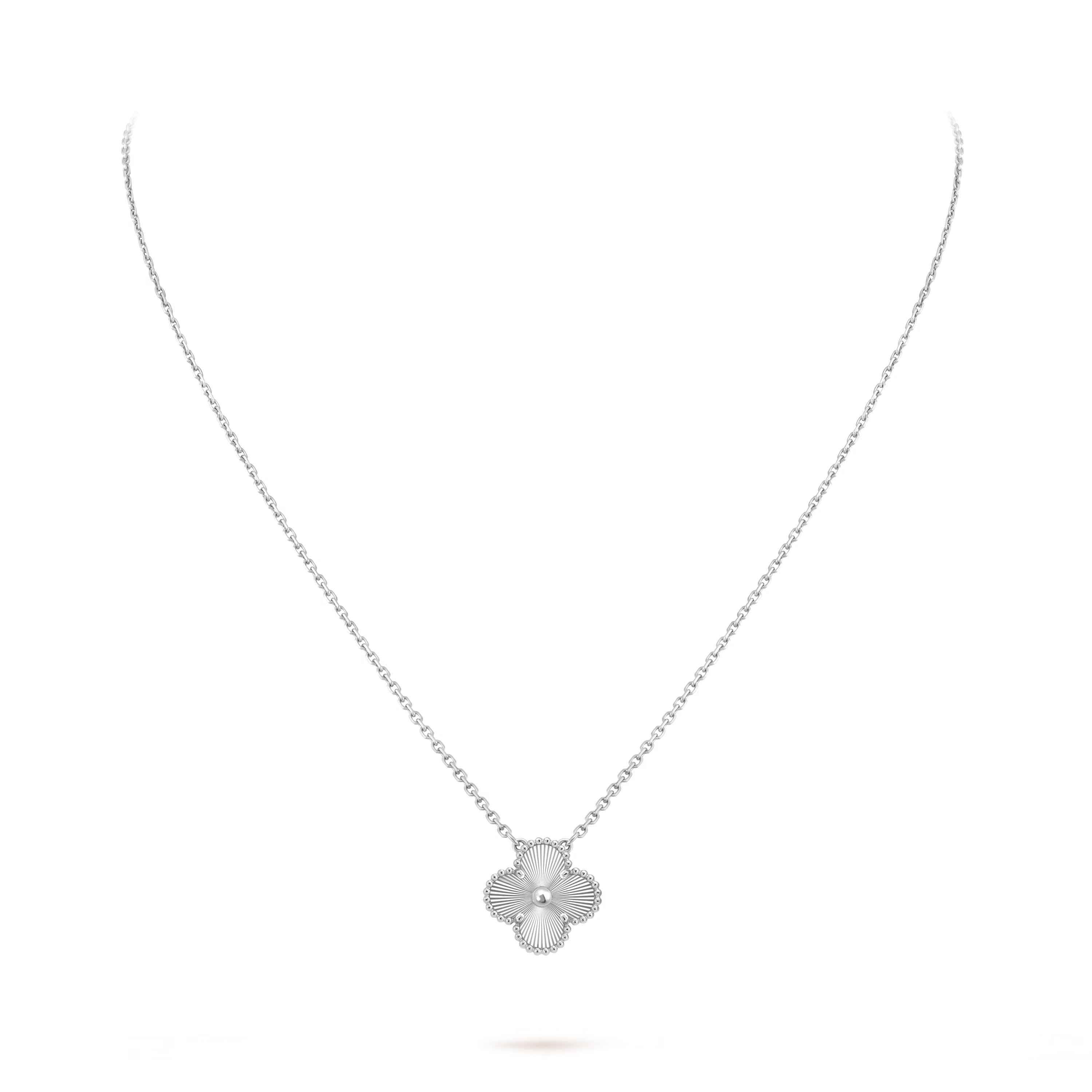 Suspended from a matching white gold chain, the pendant sits elegantly along the neckline, offering a touch of quiet luxury. Whether worn alone or paired with other Alhambra creations, it remains a graceful symbol of harmony and timeless beauty.