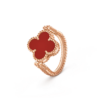On one side, a radiant carnelian motif reveals its warm, velvety hue, symbolizing vitality and joy. Flip the design, and the ring transforms into a luminous treasure adorned with a brilliant diamond, offering a refined sparkle that captures light with every gesture. Both motifs are framed by the signature golden beaded contour, a hallmark of Van Cleef & Arpels’ craftsmanship.